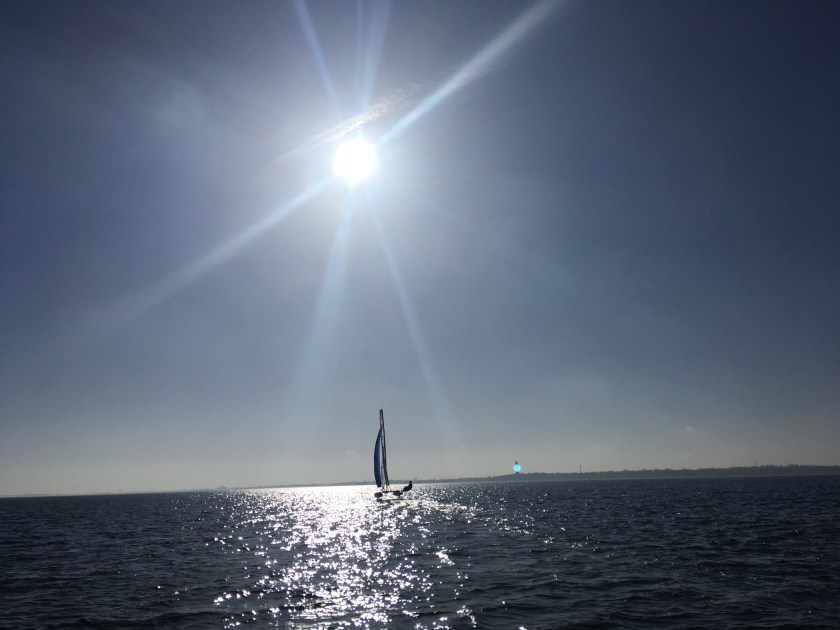 Am Dienstag verbrachte ich lustige 1 1/2 Stunden auf dem Motorboot und sicherte eine Freundin und ihren Partner beim Nacra17 segeln ab. Am Ende durfte ich sogar selbst auch einmal kurz aufs Boot steigen und zum ersten Mal in meinem Leben foilen!!! Beim Foilen hebt sich der Nacra17 – ein Katamaran – mit beiden Rümpfen aus dem Wasser und fliegt quasi. Möglich gemacht wird das durch die Tragflächen an Schwertern und Ruderblättern.