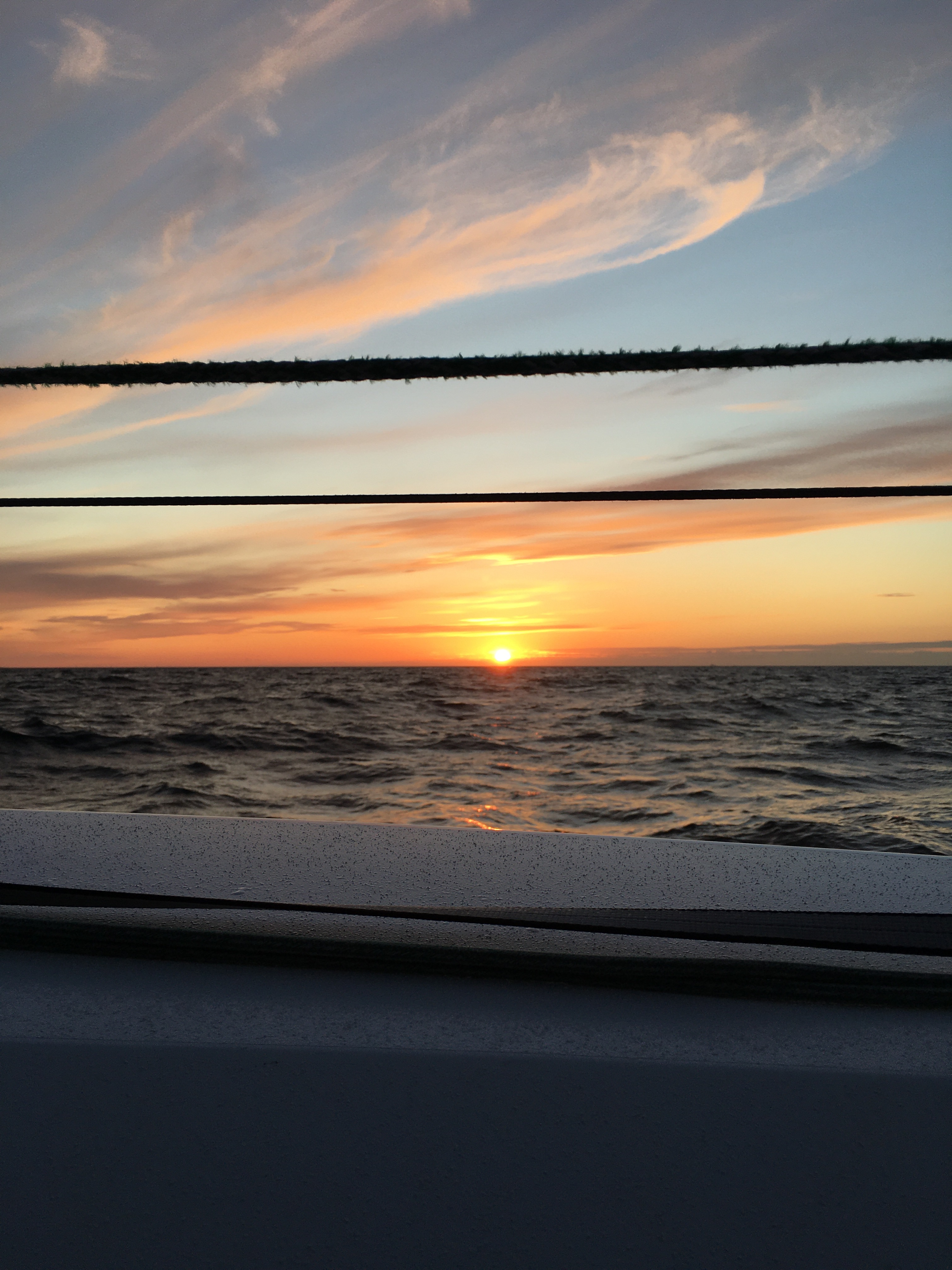 Unter Land waren die Wellen deutlich kleiner und es ließ sich dort deutlich angenehmer (und schneller) segeln. Also verholten wir uns alle 1-2 Stunden, um wieder näher an die Küste zu kommen, wobei das jedes Mal mit gebannten Blicken auf den Tiefenmesser verbunden war. Nach meinem zweiten unruhigen Powernap unter Deck sah man im Osten schon wieder einen hellen Streifen. Vor uns lagen aber immer noch 30Meilen…