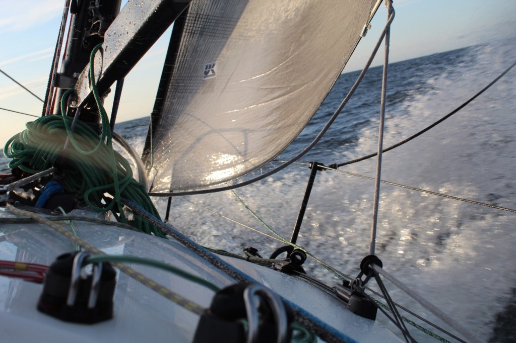 Irgendwann stellten sich dann doch knappe 5, später 6-8kts ein und bei Thoroe Rev konnte ich das erste Mal einen Gennaker ziehen. Dann ging es Dead Downwind – also mit dem Wind direkt von hinten – durch den großen Belt. Hier lernte ich die Vorzüge des Gennakerbaumsystems der Mini- Boote kennen. Mit den sogenannten Bowsprit Guys kann man diesen nämlich schön weit nach luv ziehen und somit den Gennaker quer zur Windrichtung trimmen, sodass man fast so tief fahren kann wie ein Boot mit einem symmetrischen Spinnaker. Bei dem wenigen Wind funktionierte das wirklich klasse.