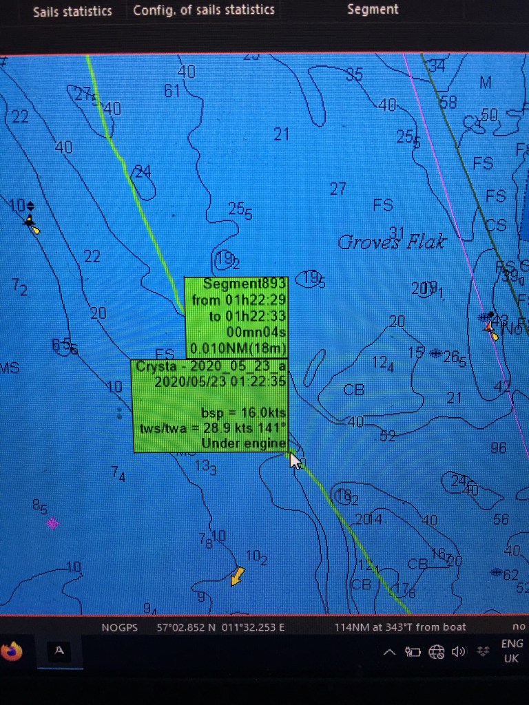 Als wir in Kiel losfuhren blies es schon kräftig mit um die 20kts aus West und während wir die Kieler Bucht verließen, waren auch schon mal Böen mit 28kts dabei. Auf einer Rennyacht ist das ganz praktisch – der Windex im Masttop misst die scheinbare Windgeschwindigkeit und errechnet daraus die tatsächliche aktuelle Windstärke. Mit dem vollen Großsegel und dem einzigen Gennaker, den das Boot momentan hat, kamen wir gut voran, waren aber mit der Besegelung echt am Limit. Hinzu kam eine steile kurze Welle, die es teilweise unmöglich machte, einen konstanten Speed zu halten.