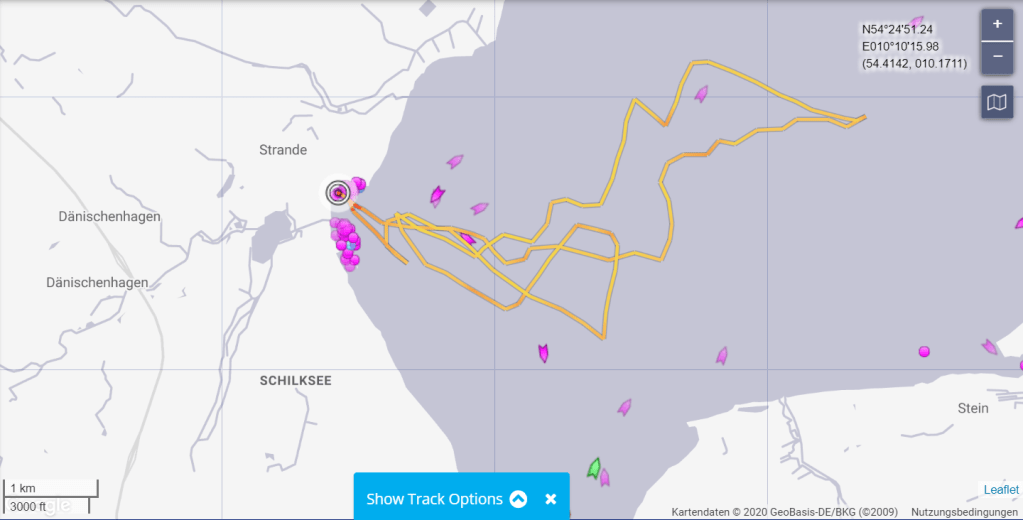 When we set off in Kiel it blew with about 20kts from West and while we left the Kiel bay, there were even gusts with 28kts. On a yacht it’s very handy – the Windex in the masttop measures the apparent wind speed and calculates the actual wind. With the full mainsail and the only Gennaker that the boat has at the moment, we were fast, but also really on the limit with the sail setup. In addition, there was a steep short wave, which made it partly impossible to maintain a constant speed.