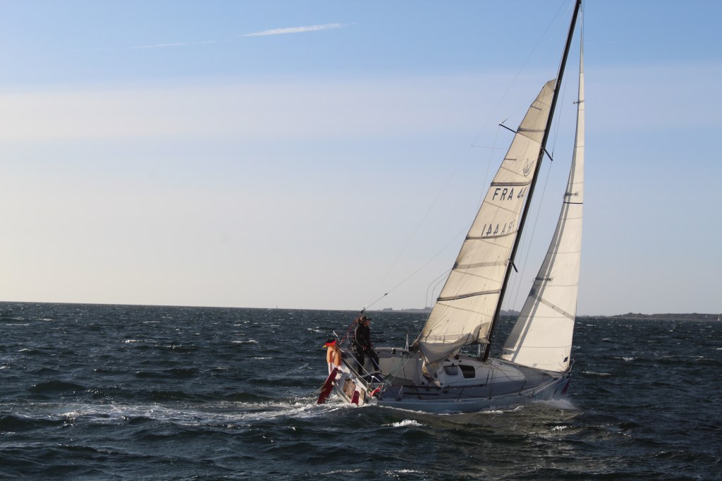 Nach dieser Aktion mussten wir erstmal tief durchatmen, bevor es mit Stagfock und Großsegel bei teilweise bis zu 39kts weiter Richtung Fehmarnsund ging. Hinter der Brücke war es etwas geschützter, der Wind hatte außerdem ein bisschen abgenommen, also packten wir „Code Zero“ aus, ein Vorsegel, das eine Mischung aus Fock und Gennaker ist. Doch auch das war uns noch nicht schnell genug, also war nach kurzer Überlegung und mit Blick auf den Wetterbericht der große rote Gennaker wieder gesetzt.