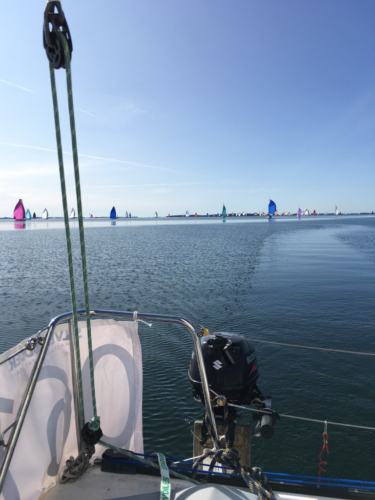 Mit der Mini hatte ich den ersten Start um 10.00. Es war klar, wir würden wenig bis keinen Wind haben und Strom von hinten. Mit dem kleinen Außenborder, den Max mir für die Regatta geliehen hatte, würde ich es schwer haben, mich bis zum Start hinter der Linie zu halten, also warf ich den Anker. Dann beschäftigte ich mich mit dem Gennakerbaumsystem und versuchte den Code 0 zu setzen. Im Nachhinein stellte sich das als unnötige Hektik heraus, denn der Code 0 wollte bei dem flauen Wind sowieso nicht zum Stehen kommen. Noch dazu war ich damit so beschäftigt, dass ich viel zu spät den Anker wieder lichtete und damit spät hinter den Anderen startete. Dann ging es auf eine Treibpartie, bei der wir mehr vom Strom aus dem Svendborgsund herausgespült wurden, als dass wir tatsächlich segelten.