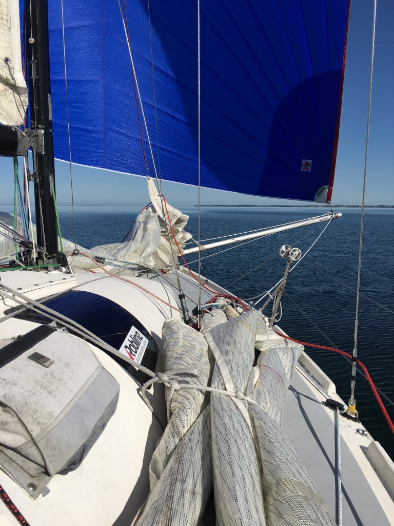 First both Max and I had to take a deep breath. Then we got the boat going again towards Fehmarnsund with only the staysail and the mainsail up whilst it was blowing up to 39kts at times. Behind the bridge it was a bit more protected, the wind had also decreased a bit, so we put up „Code Zero“, a headsail, which is a mixture of a jib and a gennaker. But that wasn’t fast enough for us, so after a quick check of the weather report, the big red Gennaker was set again.