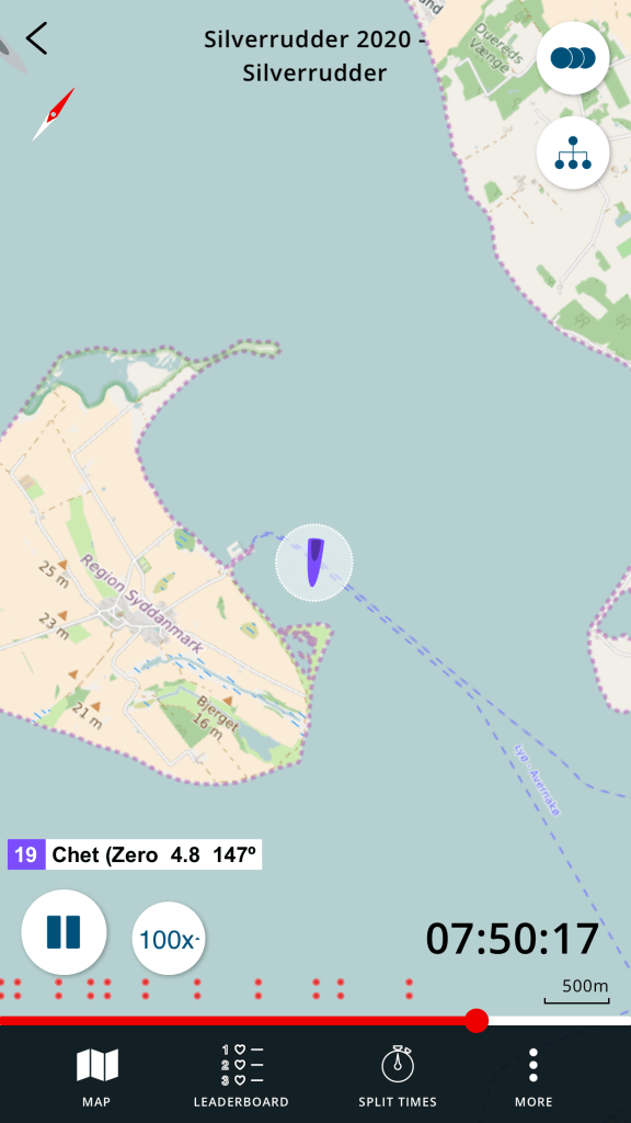 Unfortunately, the wind is again very weak, I hardly do 2-3kts and the course to Svendborg is an upwind… But with the current from behind, which is now predicted to increase more and more, I might be able to make it in time. Unfortunately, my bad judgment, impaired by my lack of sleep, was again shown. To get to Svendborg sound you have to pass the island of Skaro. I unfortunately thought a much smaller island, which was connected to Fyn by a narrow headland was Skaro and I ran aground there. I followed Max example, who had already had to go into the water twice in this race because of a sandbank, undressed and jumped into the water to pull the Mini through the wind with the bow to get off the sandbank. When I told Max about it later, I learned something very important. I was not connected to the boat when I jumped into the water. But if you are travelling alone, you must tie a leash around your belly so that the boat, when it gets free, does not leave without you. Afterall I didn’t even have a life jacket on.