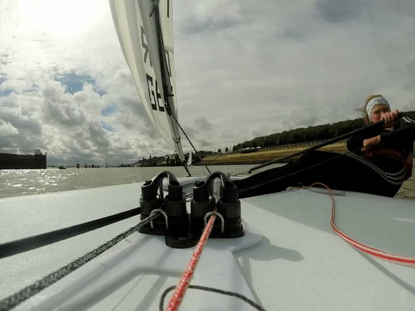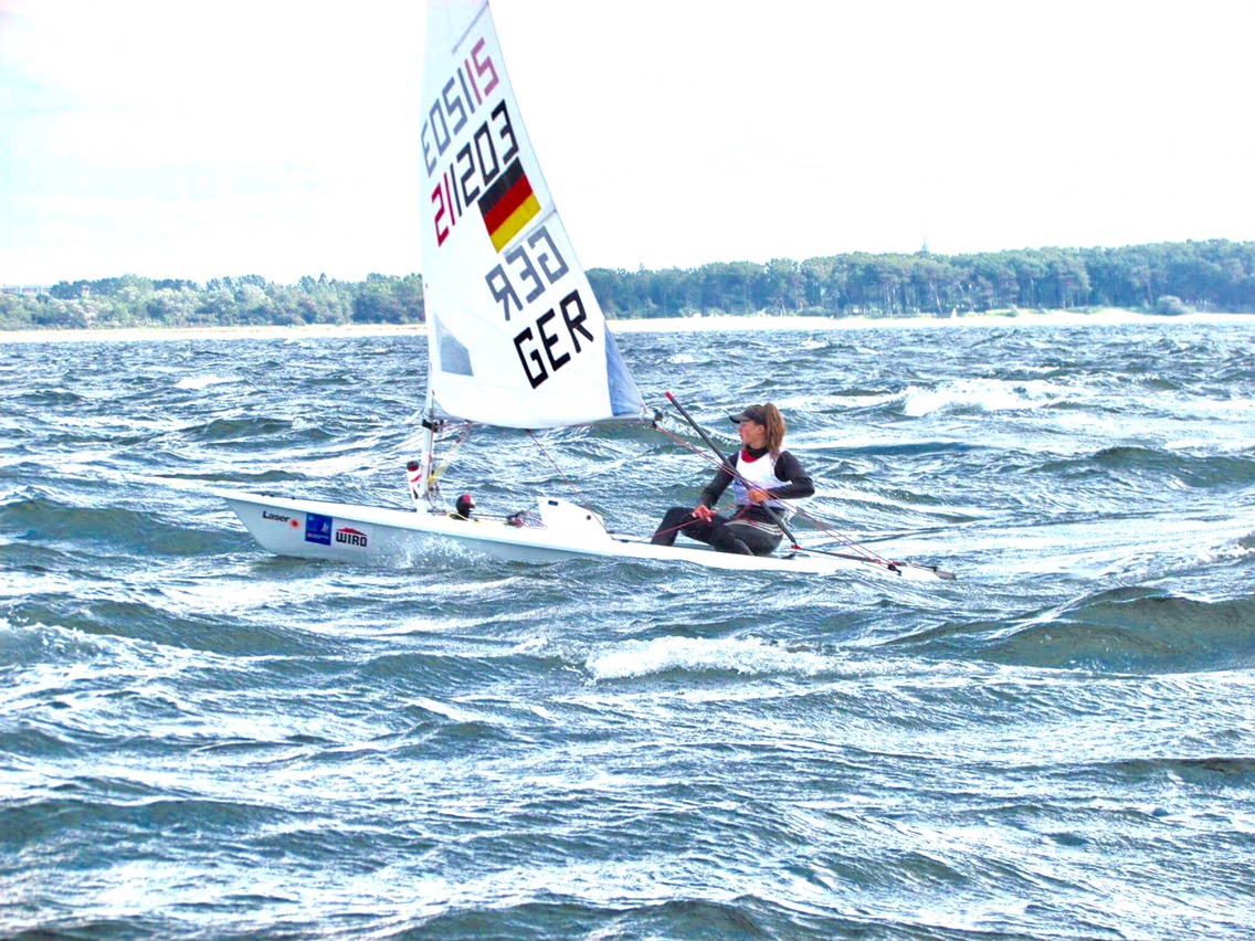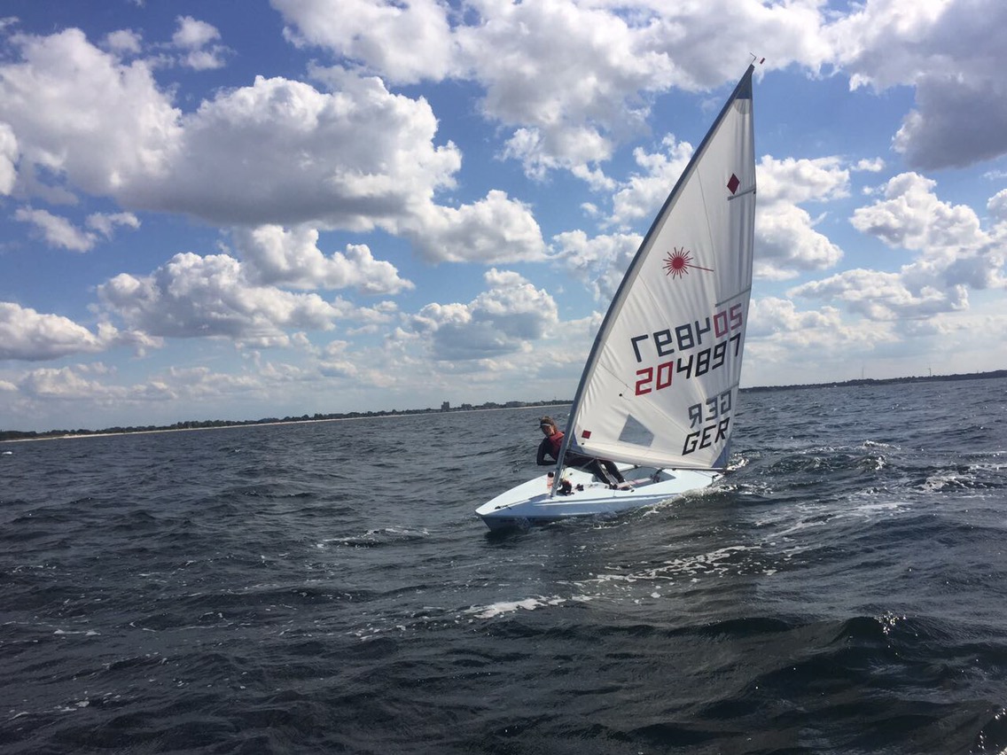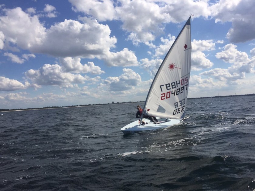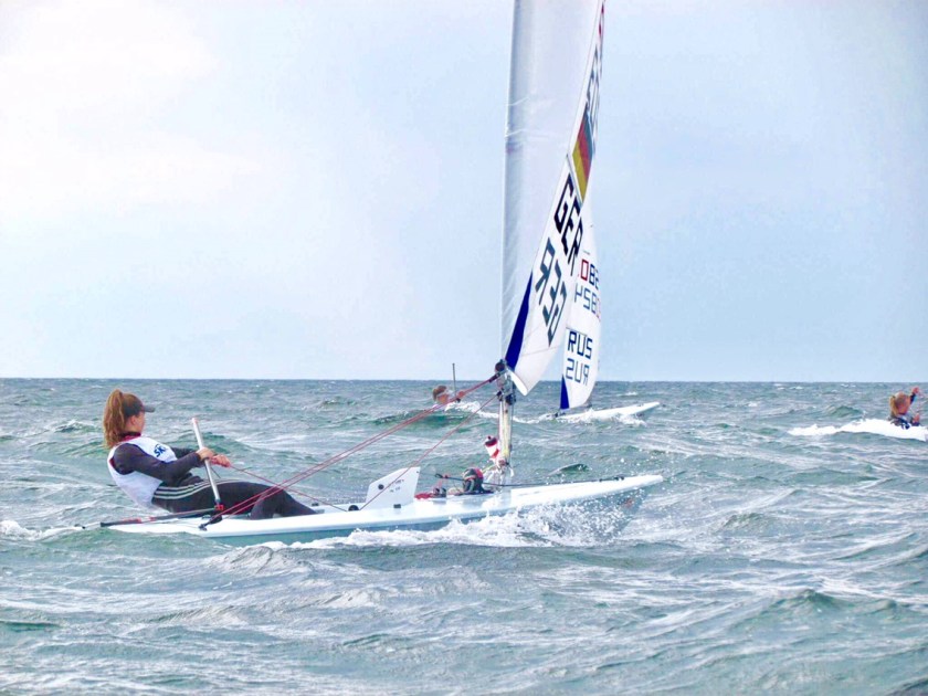 Der zweite Tag begann mit Sonnenschein und schönen 18kts aus West. Bei dieser Windrichtung hat man in Warnemünde immer eine große lange Welle, auf der man auf Vorwind sehr schön runtersurfen kann. Wir Mädels segelten den Innerloop-Kurs, also Kreuz, Vorwind, Kreuz, Reach, Vorwind, Reach, Zielkreuz, sodass man nach den anstrengenden Kreuzen auf dem Vorwind und den Reaches einfach nur nochmal alles geben und Spaß haben konnte. So konnte ich auf diesen Kursen auch immer ein paar Plätze gutmachen.