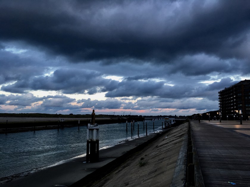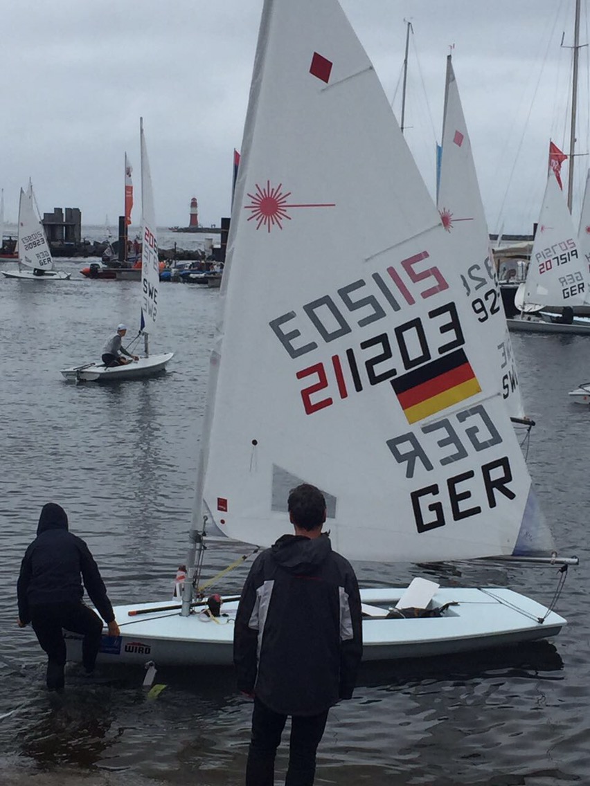 Ich fuhr mit meinem Papa nach Warnemünde und der Regen prasselte gegen die Windschutzscheibe. Wir kamen in Warnemünde an und es regnete immernoch. Nach dem Abladen der Boote waren meine Klamotten komplett durchnässt und als ich am nächsten morgen mein Boot aufbaute, taten mir die Leute, die sich schon umgezogen hatten, überhaupt nicht leid, auch wenn sie nun eine Stunde Startverschiebung lang in den nassen Neoprenklamotten verbringen mussten. Es war sowieso alles und jeder nass.