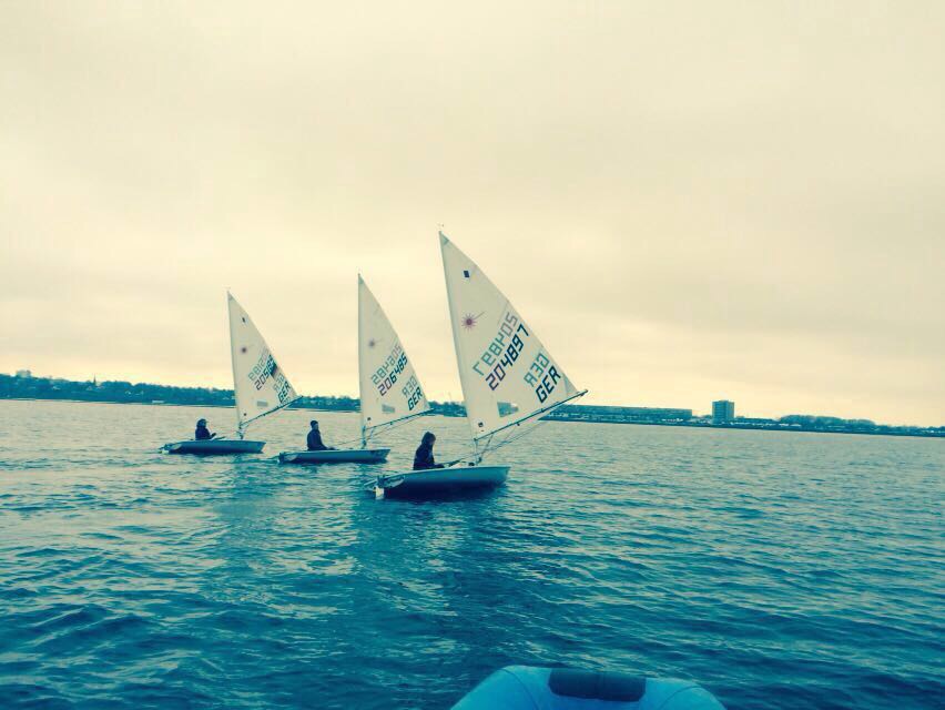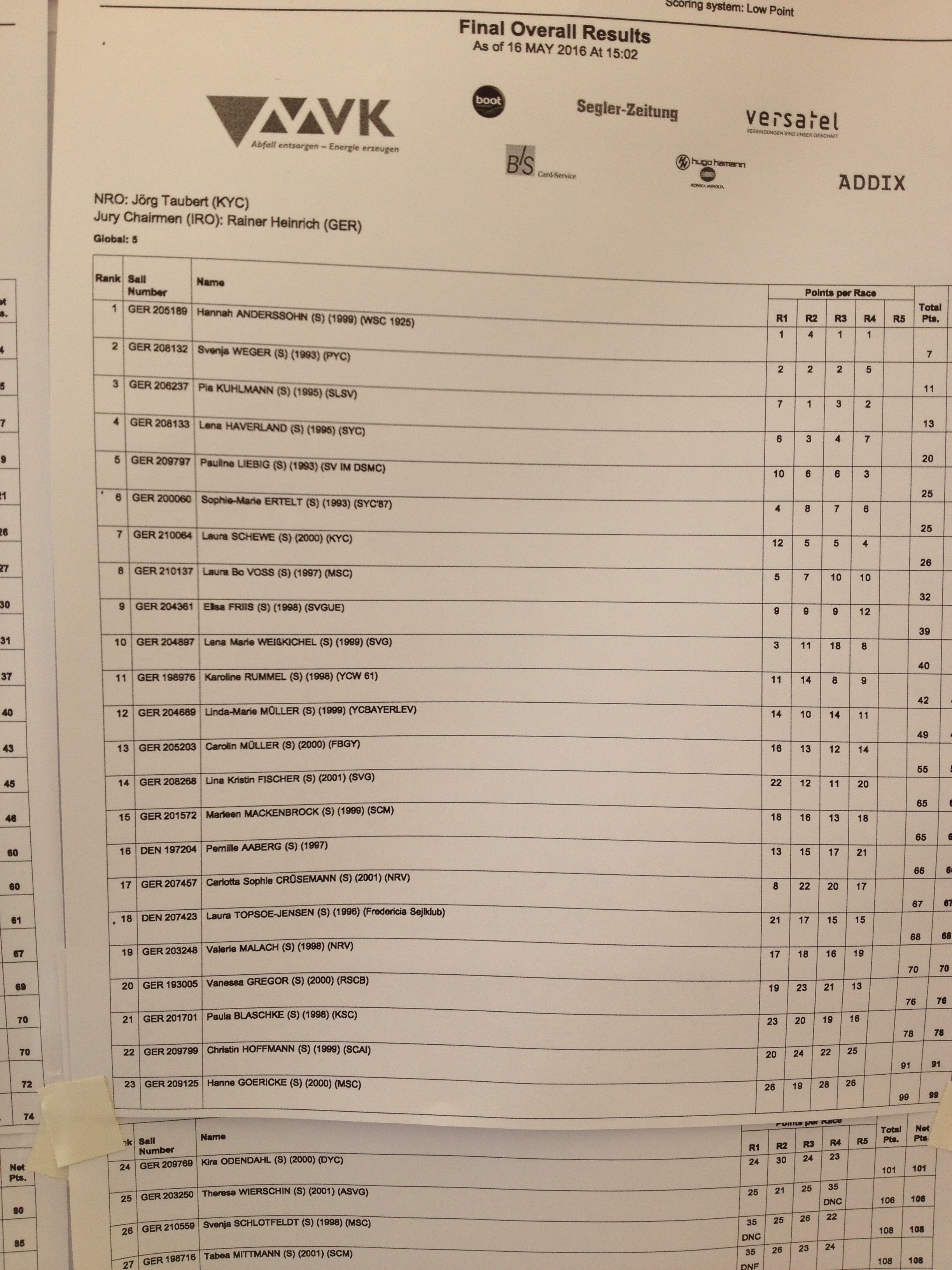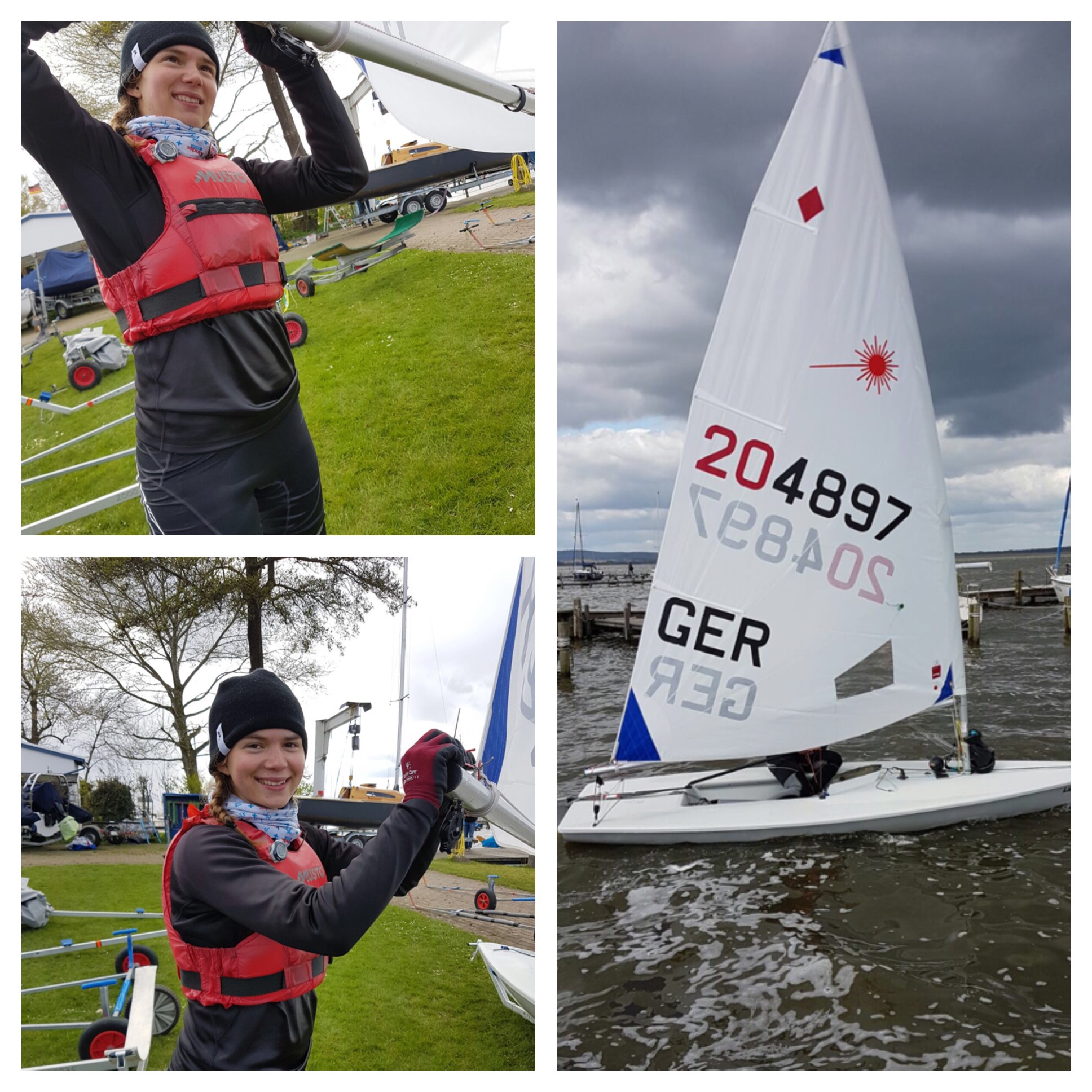 Am vergangenen Pfingstwochenende segelten wir hier in Kiel im Rahmen der Young Europeans Sailing unsere Deutsche Juniorenmeisterschaft aus. 34 Laser radial Damen gingen an den Start, mitten darunter: ich. Am Samstag solte um 13 Uhr der erste Start sein, aber weil wir Mädels erst nach den Standards und den 2 Radial-Jungs-Fleets starteten, ließen wir uns Zeit, ganz in Ruhe rauszufahren. Mit einem allgemeinen Rückruf starteten wir schließlich so gegen 13:30. Da der Wind tendenziell eher nach rechts drehen sollte, startete ich auf der bevorteilten rechten Startseite und wendete bei der nächsten Gelegenheit weg. Da die anderen erstmal weiterfuhren, wendete ich mit dem nächsten Rechtsdreher wieder zurück, um den Kontakt zum Feld zu halten. An der Luvtonne hatte ich dann nur noch 2 Gegnerinnen vor mir, von denen ich eine auf dem Vorwind noch abzog. Als Zweite ging ich auf den Reach, wo ich nur von Svenja Weger überholt wurde. Als 3. beendete ich das Rennen und war damit super zufrieden!Auf das nächste Rennen mussten wir 1,5h warten und das Rennen an sich war katastrophal. Aufgrund einer Front drehte der Wind so, dass die Kreuz und der Vorwind ein Halbwind waren und der Reach eine Kreuz. Dann wurde das Rennen zum Glück auch abgebrochen und wir wurden wegen einer Gewitterfront in den Hafen geschickt. Wir hatten also in 5 Stunden Wasserzeit 1 Wettfahrt geschafft – keine starke Leistung. Auch am Sonntag klappte es mit dem Regattasegeln nicht so wirklich. Bei der einzigen Wettfahrt des Tages wurden wir so von einer Gewitterfront überrascht, dass bei uns Mädels noch nicht einmal mehr die Hälfte ins Ziel kam. Ich war als 11. die Vorletzte, die die Ziellinie überquerte. Doch das brachte mir leider gar nichts, denn das Rennen wurde annuliert.